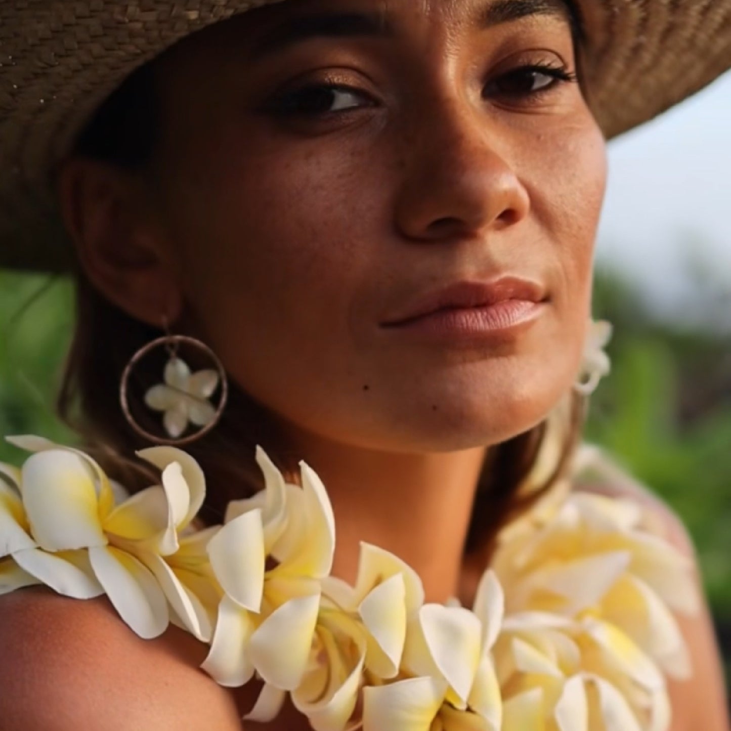 Soft pale yellow and creme colors in these carved mother of pearl Pua Melia Hoops is the perfect tropical vibe.